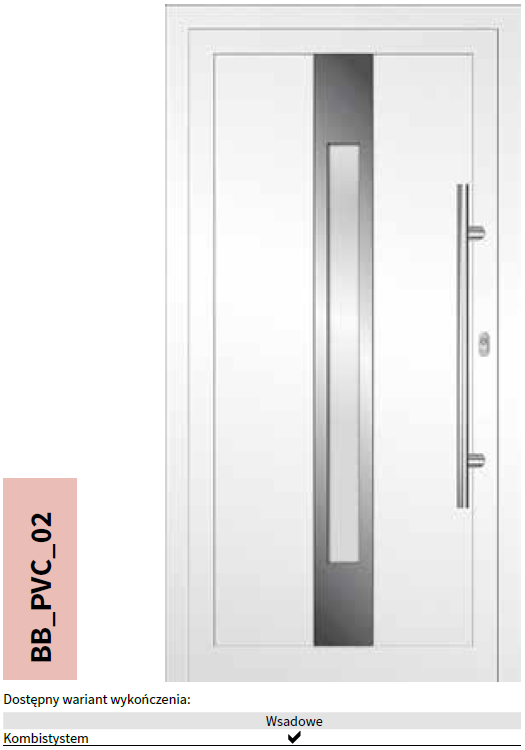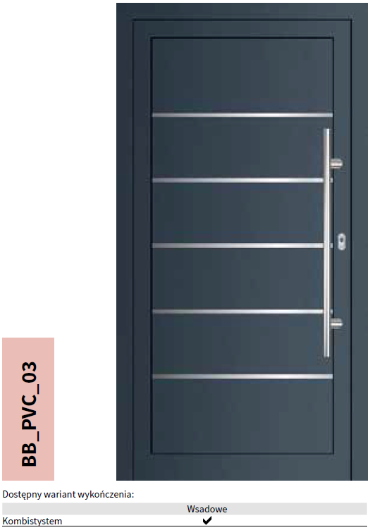 PVC deuren zijn voorzien van applicaties Alu-Inox, die standaard verhoogd zijn, wat betekent dat ze bol staan ten opzichte van het deuroppervlak. Deze toepassingen bevinden zich zowel aan de buiten- als binnenzijde, waardoor de deur er vanuit elk perspectief elegant uitziet. Bovendien benadrukken deze details het moderne karakter van het bouwwerk, waardoor het een unieke uitstraling krijgt.
